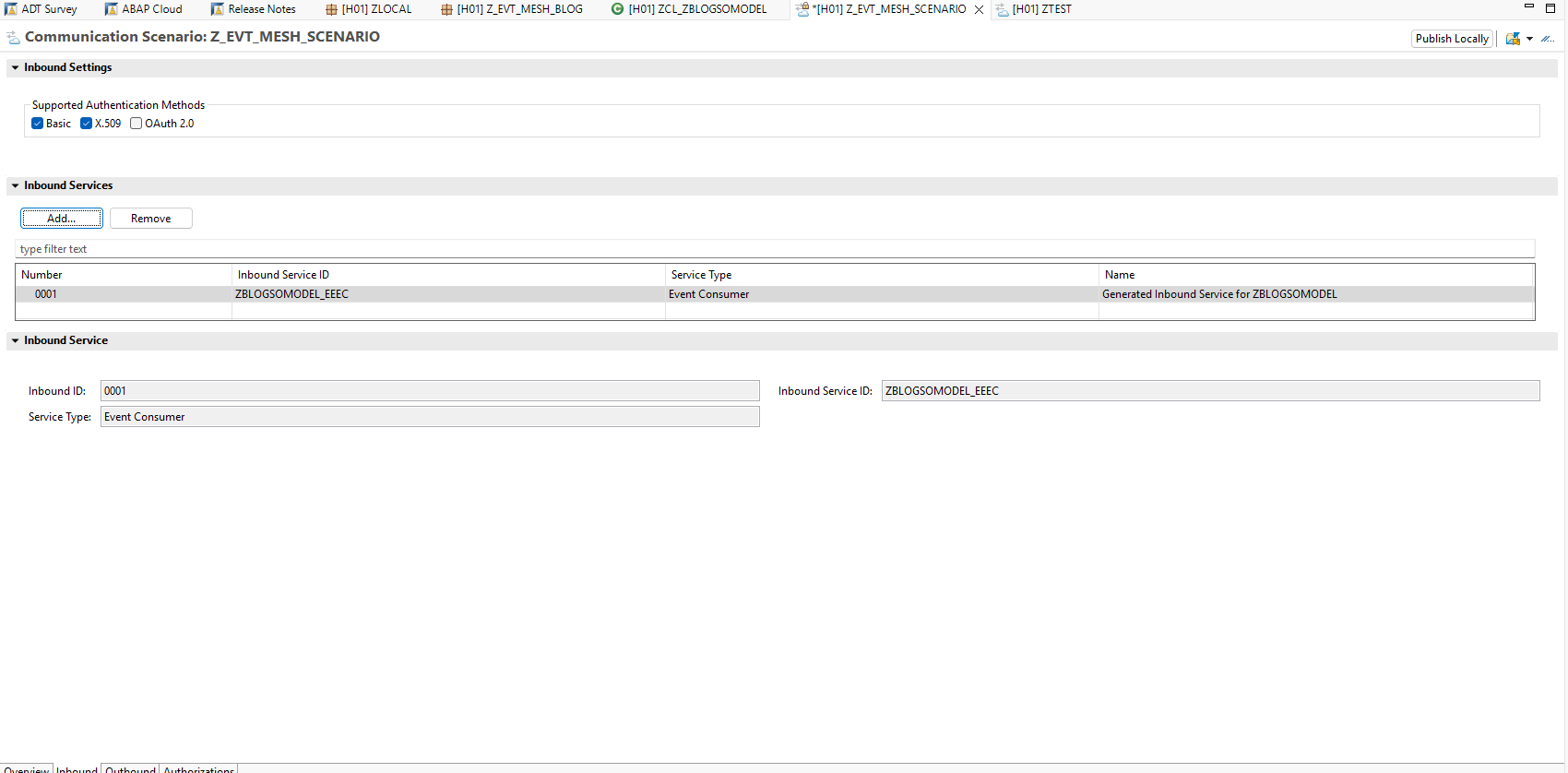 The Communication Scenario only has name, description and package as mandatory parameters. After entering the required transport information, we can click finish and should be presented with the Communication Scenario Overview tab. The tab we are actually concerned with here is the Inbound tab. Click that, then click the “Add” button within this tab. Search for the Inbound Service we created during the Event Consumption Model generation, then click save. Finally, click the “Publish Locally” button to allow the Communication Scenario to be used within our Communication Administration dashboard: