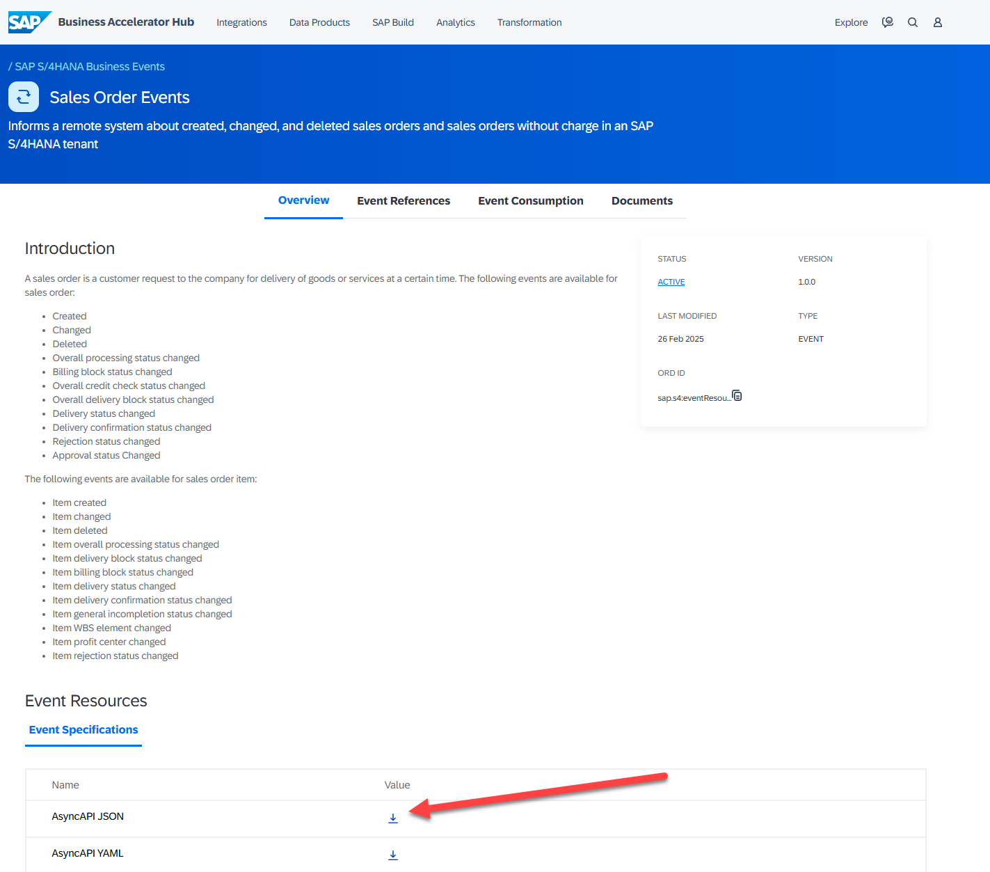 The most important part of this process is the AsyncAPI file. This file contains all of the details to generate our object correctly, so it is important to get metadata information correct. Fortunately, we can download this AsyncAPI file directly from the SAP Business Hub! To do this, navigate to http://api.sap.com , search for “Sales Order Events”, then filter your results by “Event Objects”. Once we find the appropriate result, we can click that result and fine the AsyncAPI JSON at the bottom of the page.