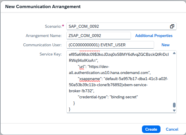You’ll notice that as soon as we input that scenario, the input screen automatically adjusts by adding two additional input fields, one for communication user and one for our Service Key. If an appropriate communication user exits, we can simply enter that username here. If one does not, we can click the “New” link and follow steps to create a new user and password. For the Service Key, we will need to go back to our BTP Cockpit, locate our Event Mesh service instance, and then generate/ copy a new Service Key. If you have been following along with this blog series, this is the same exact process we followed to generate our Event Mesh service key in the Event Mesh blog. For security reasons, make sure to use a new key per system. Lastly, keep in mind that the Communication Arrangement name provided here will also serve as the Communication System/Event Channel name.