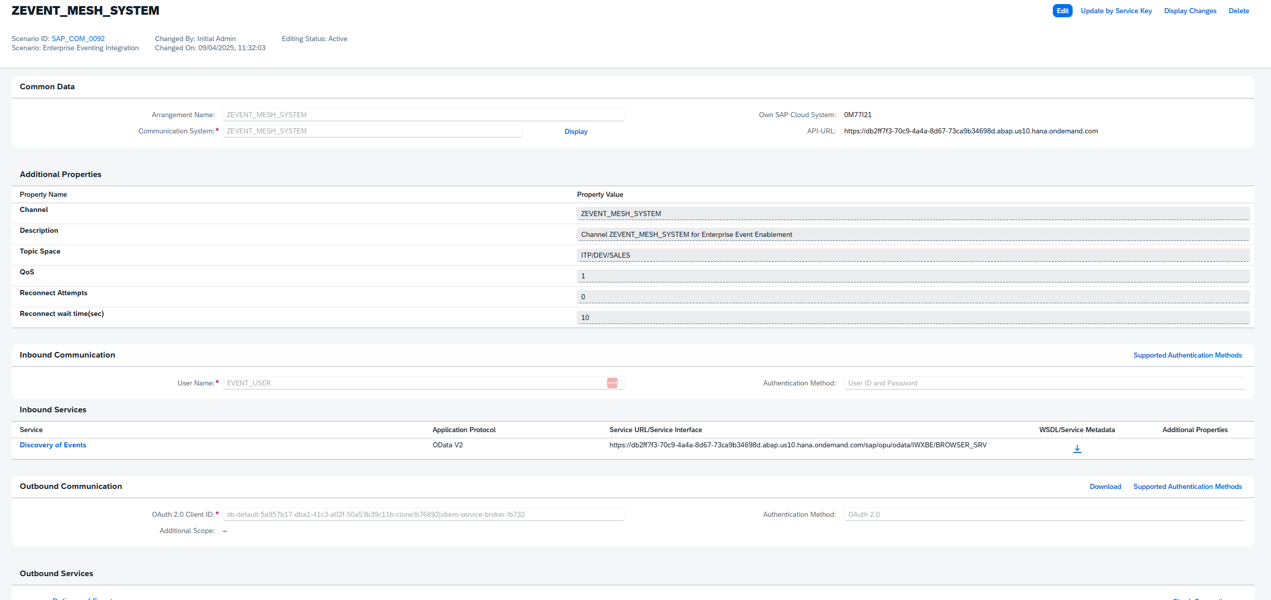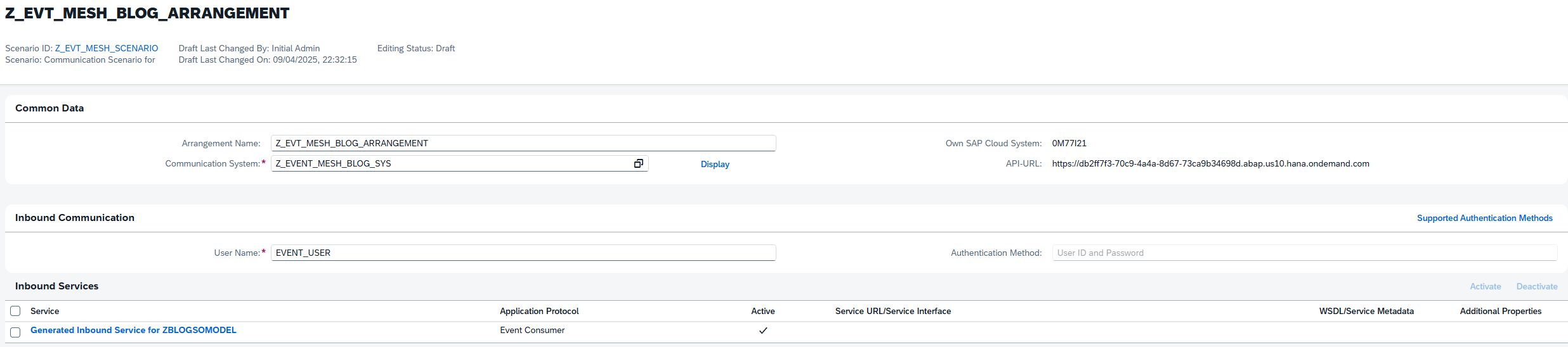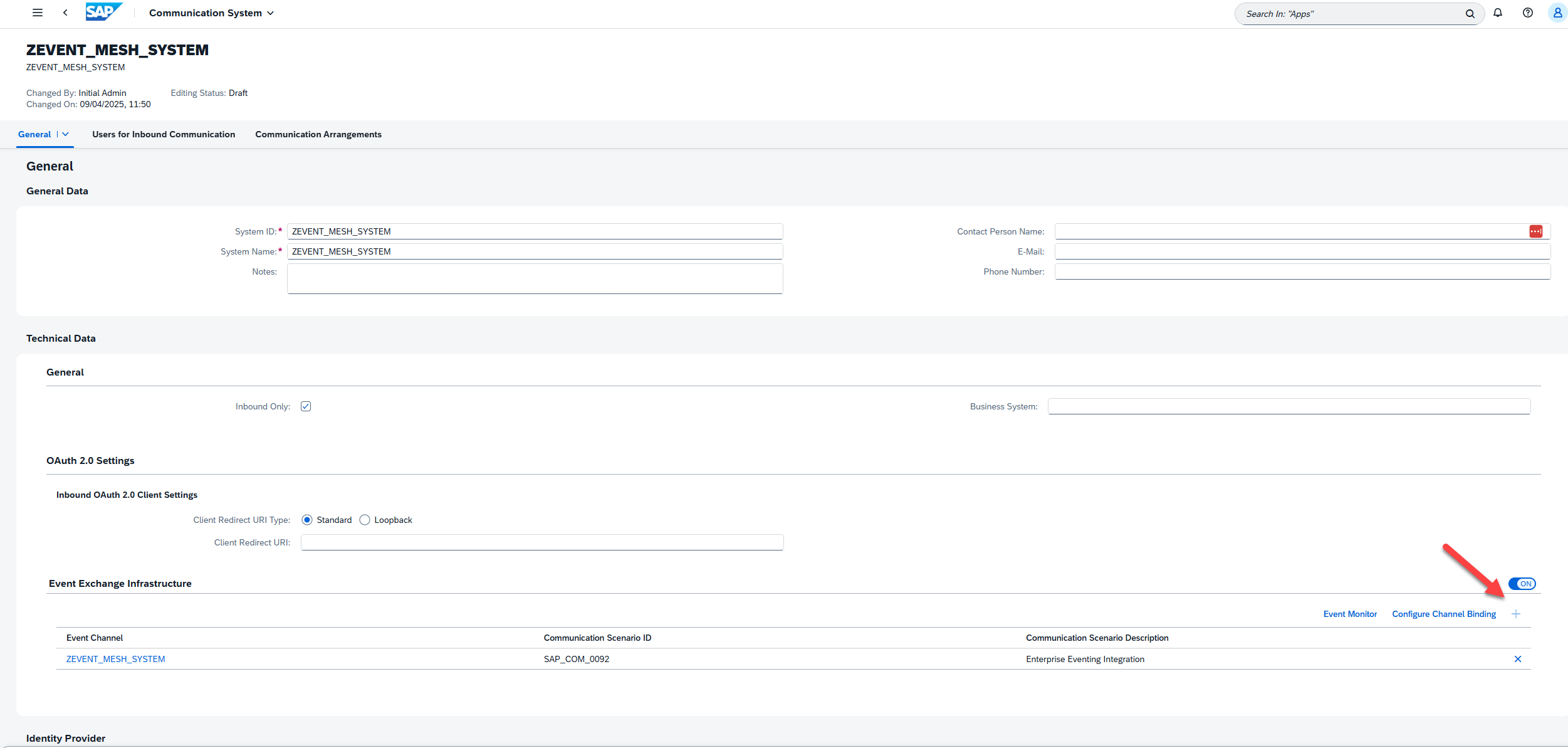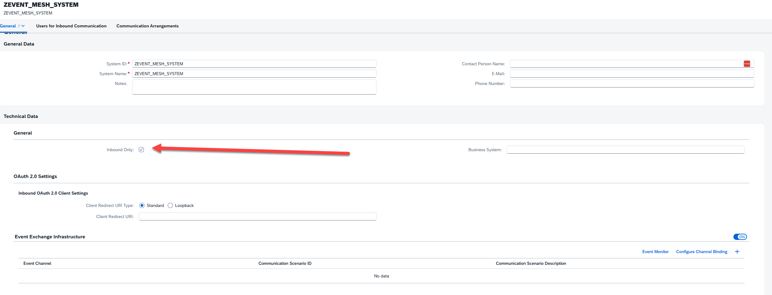 Finally, return to the Custom Communication Arrangement and input our newly created system in the Communication System field. This should automatically populate the user field with the systems Inbound user. Click save, and we’re finished. Our integration between our ABAP Event Consumer object and the Event Mesh is now complete.