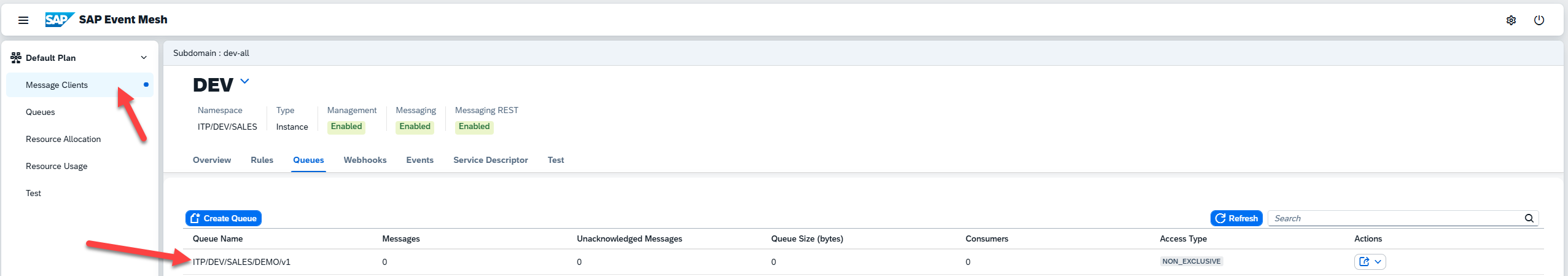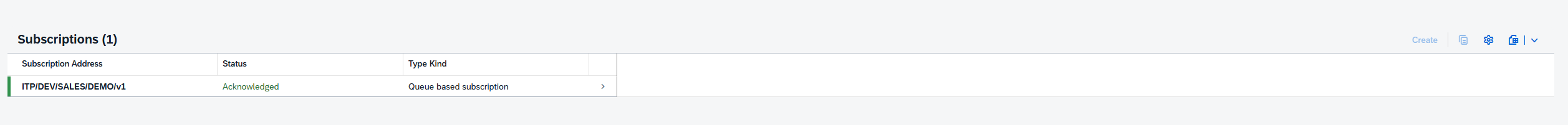Next, we click the “Configure Channel Binding” button in the Event Exchange Infrastructure subsection, where we’ll specify our queue subscription. On the next page, enter edit mode and click “Create” within the subscriptions section. The configuration screen will request you enter Subscription Address, which is just the queue name for the queue we want to receive events from. If you don’t remember this, you can always return the Event Mesh dashboard and find/create the appropriate queue: