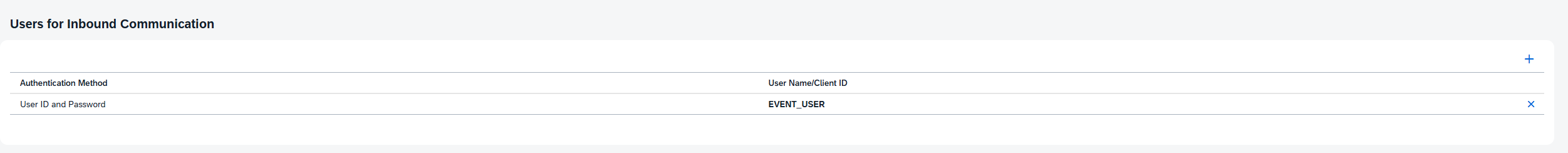 Return to the Communication System configuration screen, remembering to save where available to set the current version of the configuration to active. Before saving the Communication System configuration itself, scroll to the bottom of the screen to the section labeled “Users for Inbound Communication”. You can either create a new, unique user for this scenario, or use the same user we created for the Enterprise Event Integration step: