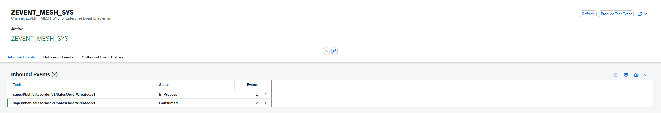 Our next step is to test whether our integration is working. The best way to test this is to head over to our SAP system and check whether our Sales event makes it to our ABAP system. To do that, we can use the transaction SWUE to generate a sales event (covered in previous blog). Once we’ve done that, we can follow the path Administrator->Communication Management->Enterprise Event Enablement Event Monitor to check whether the event was detected: