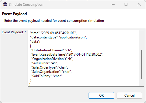 Once again, we can use the SWUE transaction in our SAP system to test our integration. As another option, however, we can also use the “Simulate Consumption” feature of our Event Consumption Model artifact to mock a generated event. This option provides you an input field to modify an event template, or paste in a re-usable JSON file: