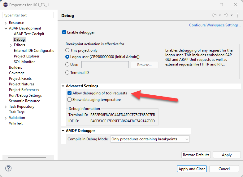 Note that you can debug this process, especially if you are having trouble with the code logic itself. If you would like your breakpoints to trigger, however, you need to switch on an advanced ABAP Debugger setting that is turned off by default. The path can be found below, after first right-clicking your project and clicking the properties button: