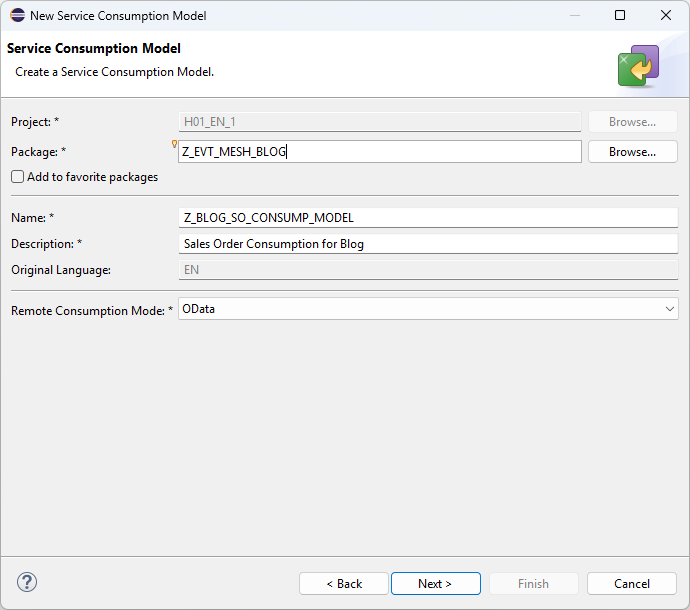 Once we have downloaded the appropriate EDMX, head back to Eclipse to create a new Service Consumption Model. Naming conventions should, of course match our customer namespace: