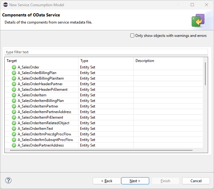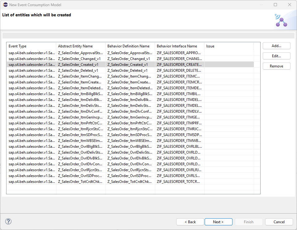 Back in Eclipse, we can select our JSON that we have downloaded to our PC and proceed with the next steps. Over the next few screens, you’ll see a list of various components SAP generates for you based on the AsyncAPI file. On the next page, you’ll see the “Entities to be created”. In some scenarios you may not need all of the various events that come with a particular business object. That would be the case with this blog, for instance, since we only need the “Created” event. However, for purposes of illustration, we will leave all the entities as-is and proceed through the setup guide.