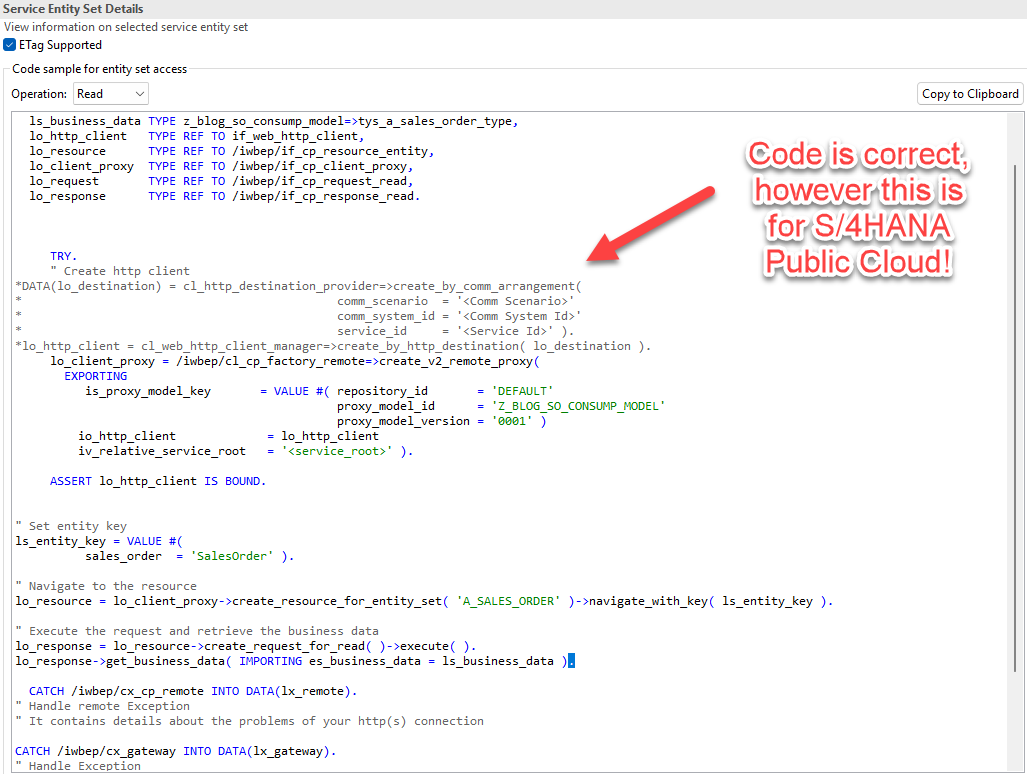 Looking over the generated code, you’ll notice that everything has been generated and looks active outside of the first of the code. The portion of the code has been commented out and relates to determining the destination when consuming the Sales Order service. This is because, based on whether our system is a cloud system or an on-premise system, the way we connect will be very different.
