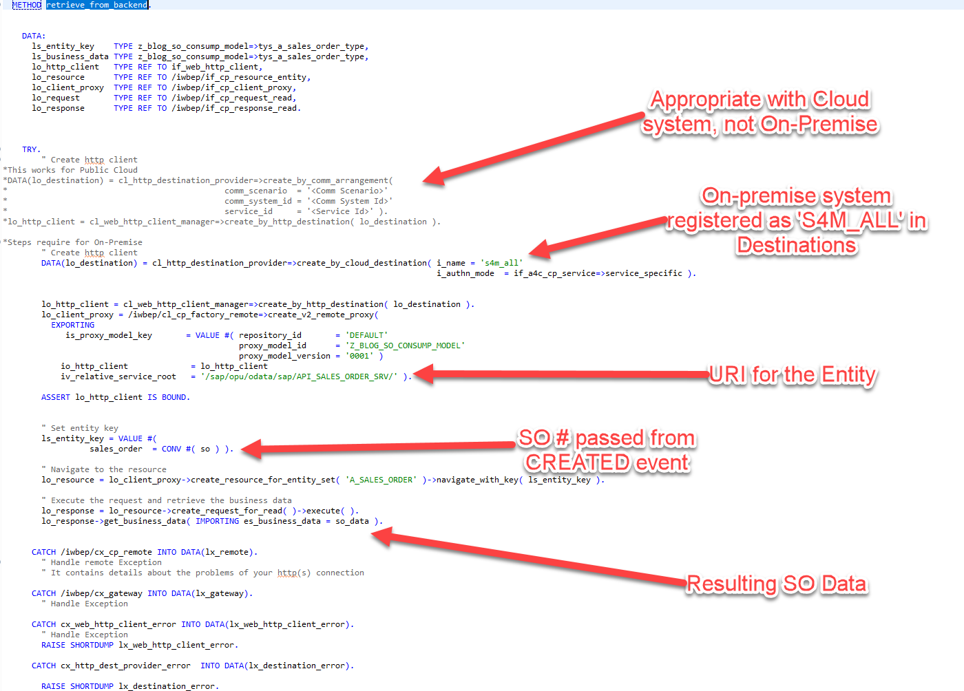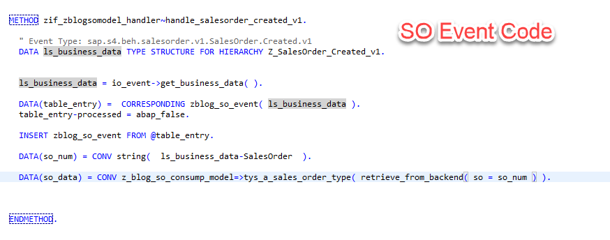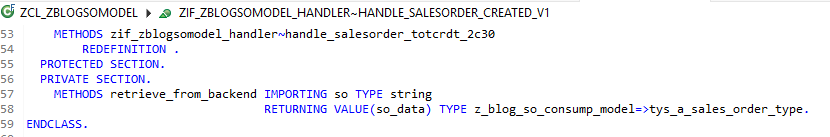 With our Destination created and the Destination Service up and running, we can complete our solution and use this service to retrieve additional Sales Order information from the backend system. To execute our data retrieval, we will create a new METHOD within our Event Consumption Class called RETRIEVE_FROM_BACKEND. This method will do nothing more than take a Sales Order number as a parameter, call our backend service using the generated code. Two small modifications are made to SAPs generated code: we will need to modify our code to retrieve our on-premise Destinantion from the Destination service, and we will need to enter the correct URI to target our Sales Order service. The results of the RETRIEVE_FROM_BACKEND method, the sales order data, will then be returned to our Sales Order Created method, where it be utilized in our next and final blog to send our Tweet: