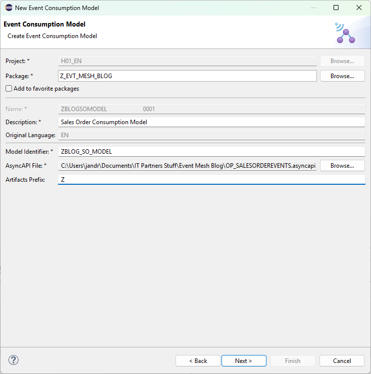 When you get to the model creation screen, populate the details as required. Two things that we want to pay attention to here are the Artifacts Prefix, and the AsyncAPI file. The artifacts prefix can be whatever you would like, as long as it matches the customer namespace. This is the Z* Y* patterns ABAP developers are used to. Be careful, as Eclipse does not warn you until you attempt to generate the artifacts that there is an error.
