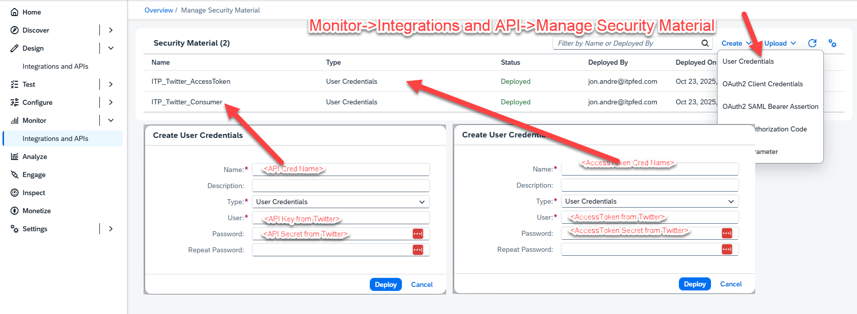 The menu path is Monitor->Integrations and APIs->Manage Security Materials: