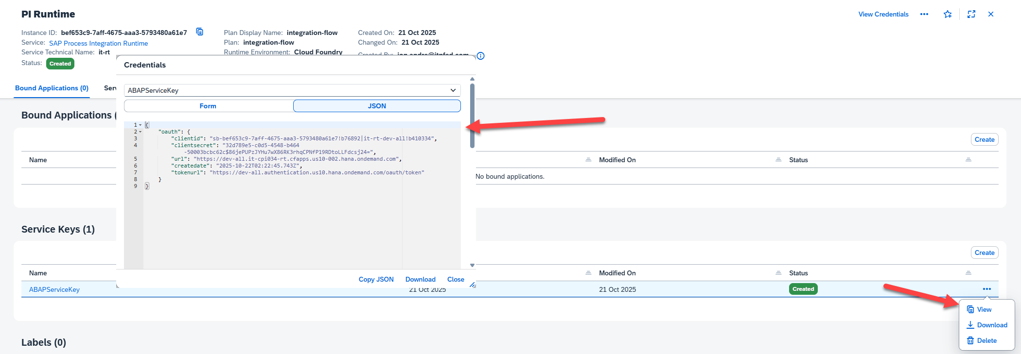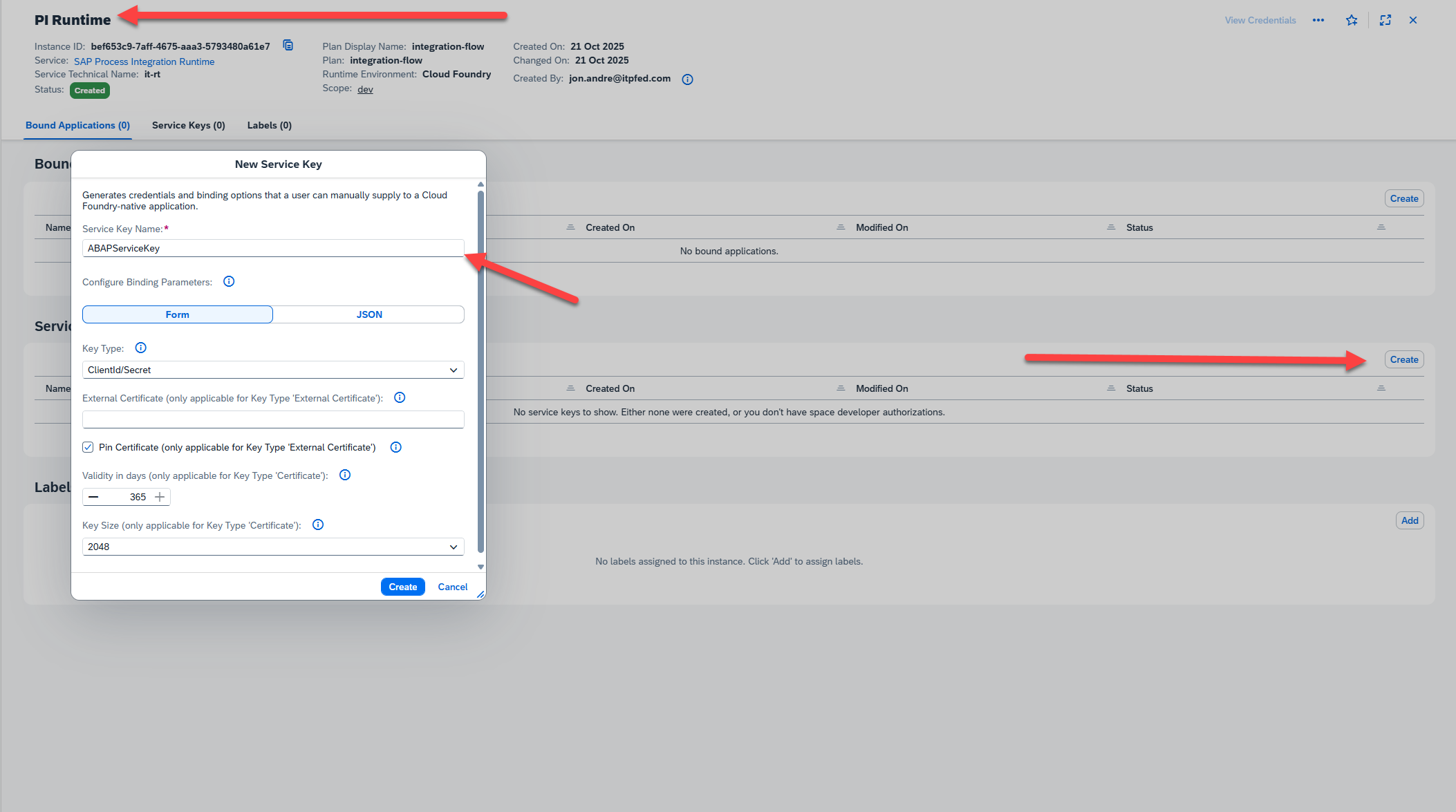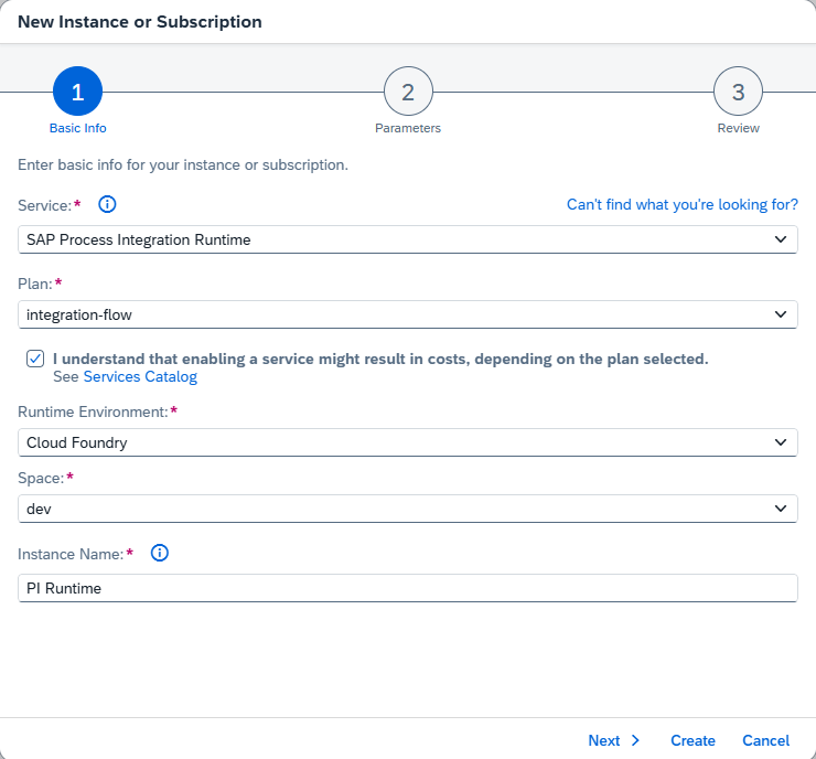 Our next step is to create a service key for our Integration Suite instance. We will need this to connect to our iFlow from the ABAP environment. To do this, we will go back to our BTP dashboard, create an SAP Process Integration Runtime-> integration-flow service instance, then use this service to generate a service key to be used in the ABAP system. By this point in the blog I will assume you are a pro at this. So, instead of explaining step by step, I will include a few screenshots of the steps to follow: