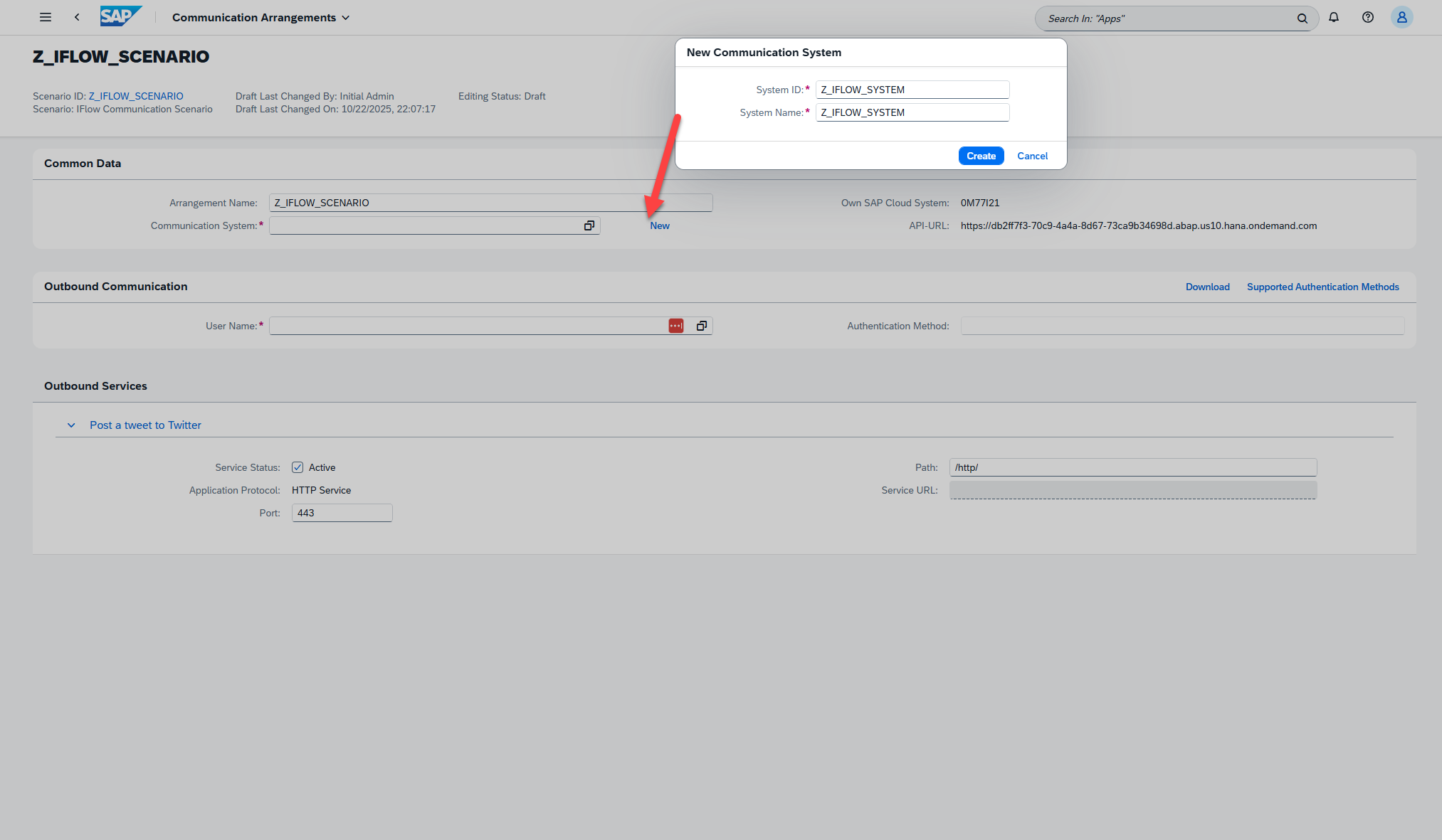 You may notice that, unlike when we created the service to connect to our SAP system, we did not require and metadata for Service Definition. This is because our iFlow is very simple and we have no need for structured OData request. To post our Tweet, as you will see momentarily, we simply just specify the text in the body of the post. So, the creation of our Service is a bit of a “dummy” service. It is required, however, because we cannot have a communication arrangement without an attached service.