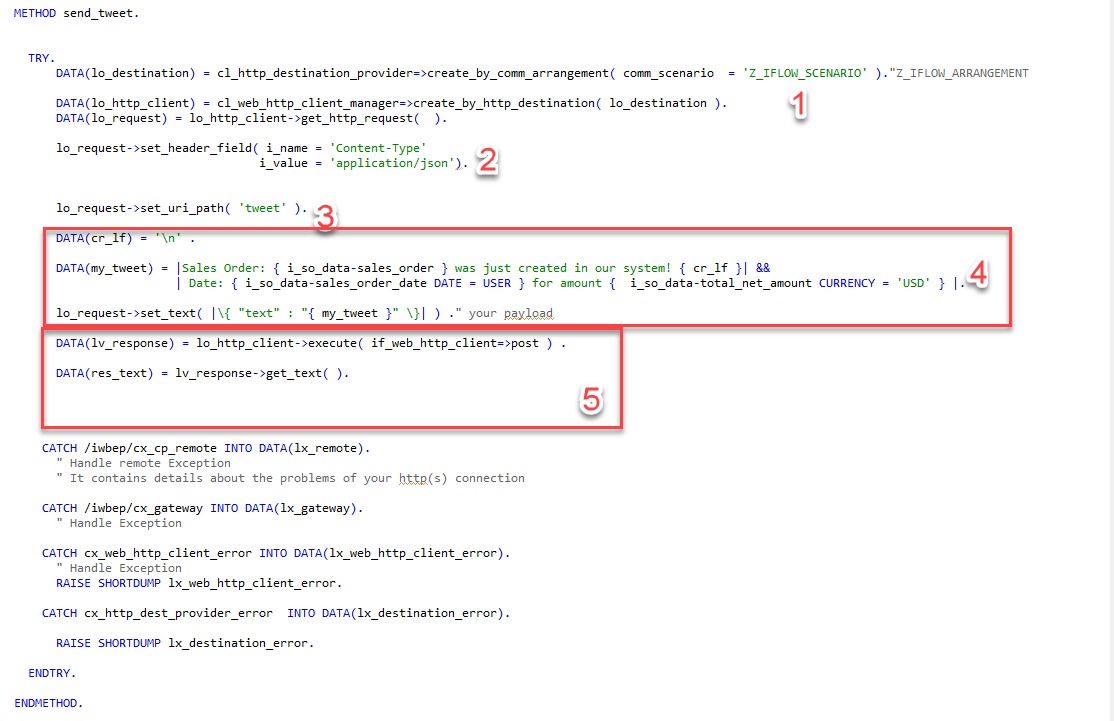 - Builds the raw text of our Tweet. This used both a text template and the actual date we retrieve in our OData call to the SAP system. It then sets the text of our HTTP Post body/Tweet.