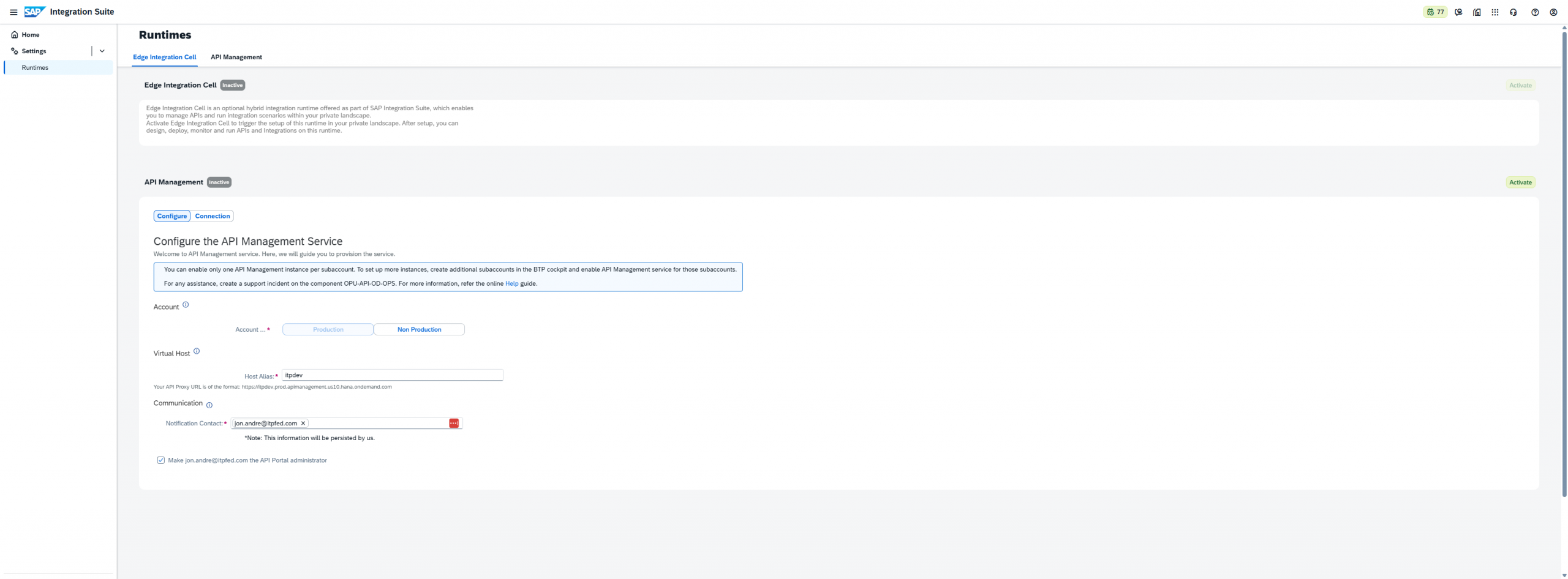 For here, I picked “Non-Production”, picked an appropriate Virtual Host, and entered my own email as the IS admin. Then finally, click “Activate” to begin the activation process: