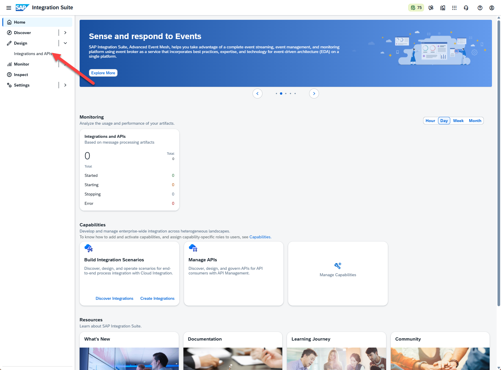 There is a lot to explore here, but it would take multiple dedicated Integration Suite blogs to cover all of the functionality. For now, we will focus on the option that allows us to create the next artifact in our extension, which is the iFlow. To do this, we will select the “Integrations and APIs” option under the “Design” section: