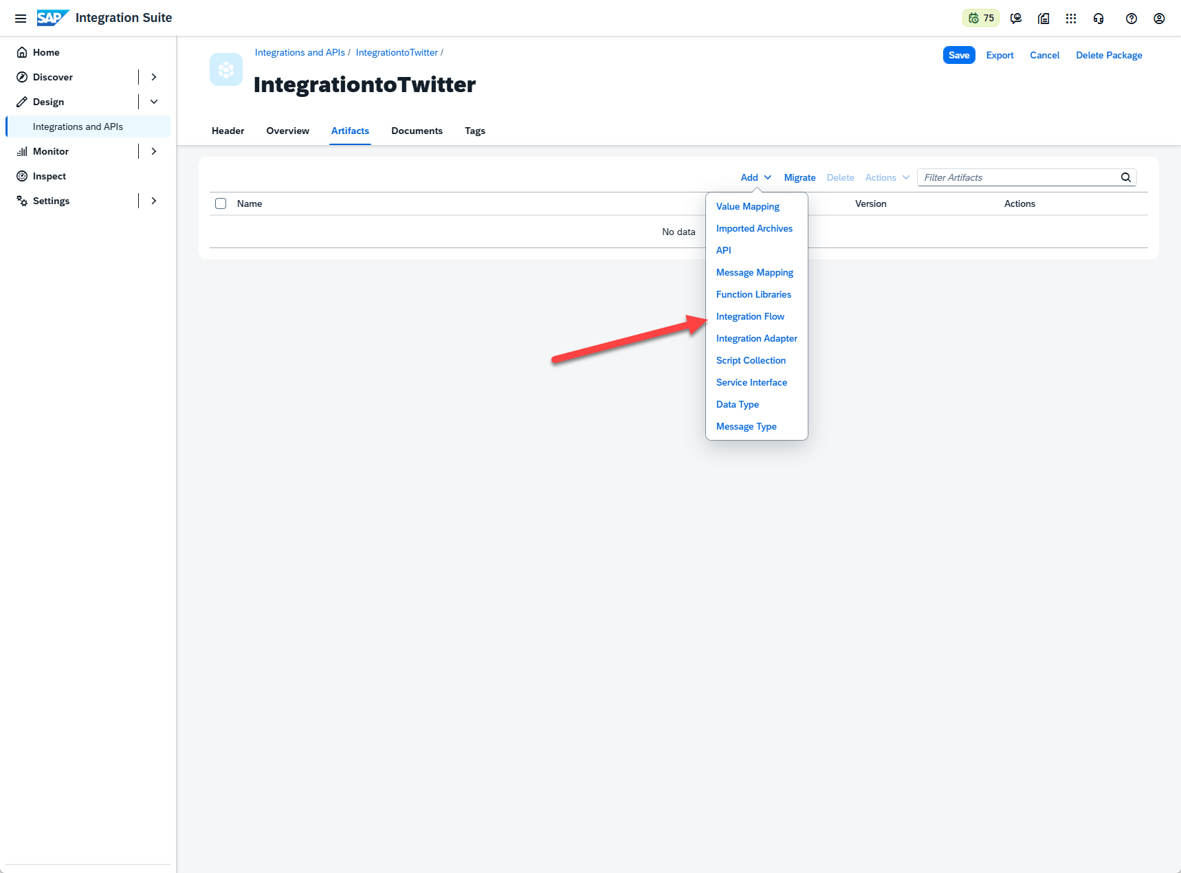 Within the Integrations and APIs, the first task we’ll have is to create a package. Here we can just provide an appropriate name and description, just keeping in mind that the technical name, while free text, cannot have spaces or special characters. After the package is created, we can navigate to the Artifacts tab. In edit mode, we click the button to “Add” a new artifact, and select “Integration Flow”:
