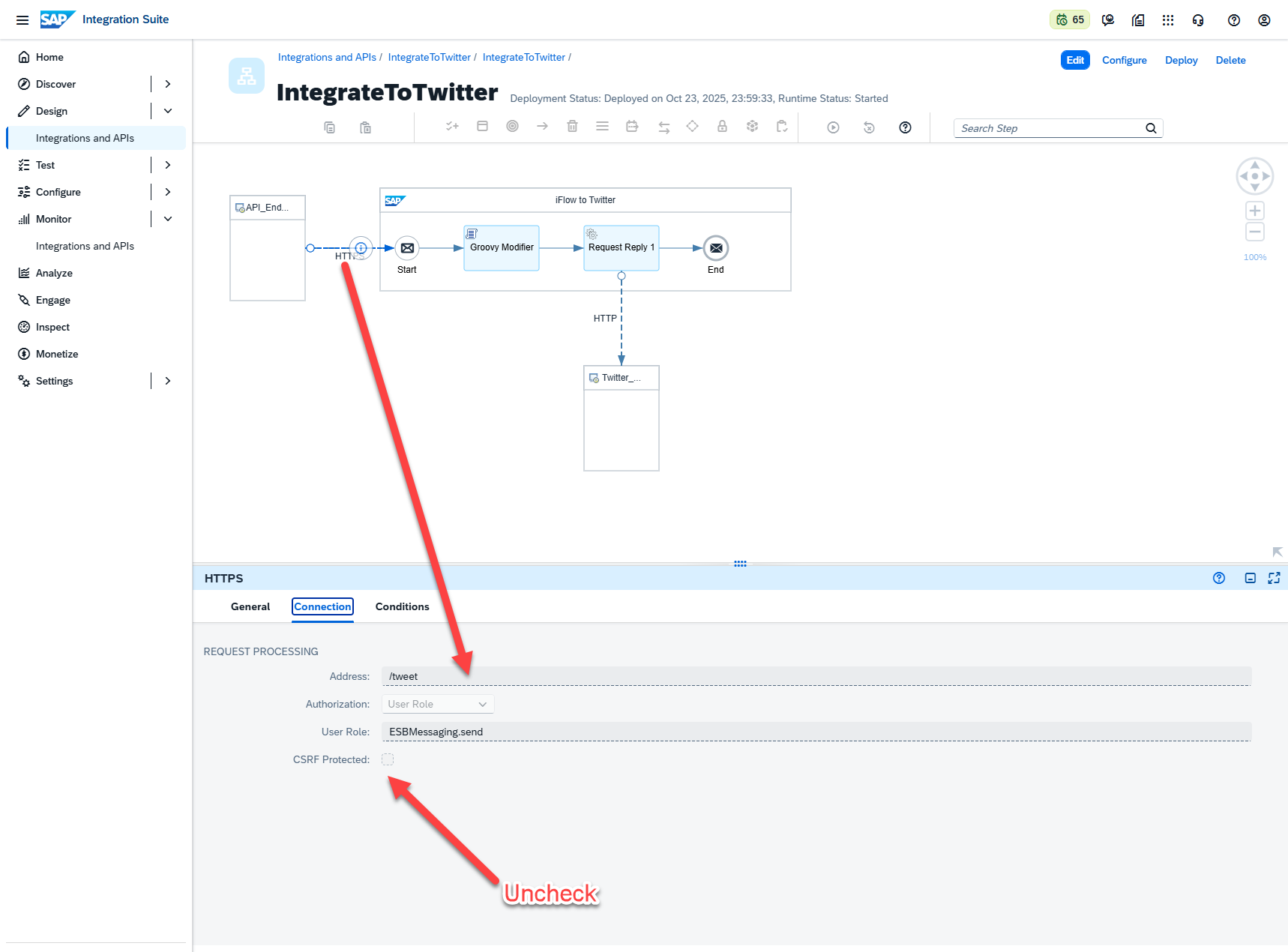 With our iFlow connected and deployed, we want to retrieve our API endpoint. To do this, we can navigate to Monitor-> Integrations and APIs -> Manage Integration Content -> Started. In here, we will find the Integration Content we’ve created. Click on the appropriate content to the Twitter integration and you will find the URL corresponding to your API. If you don’t see this here, double check that you already deployed your project: