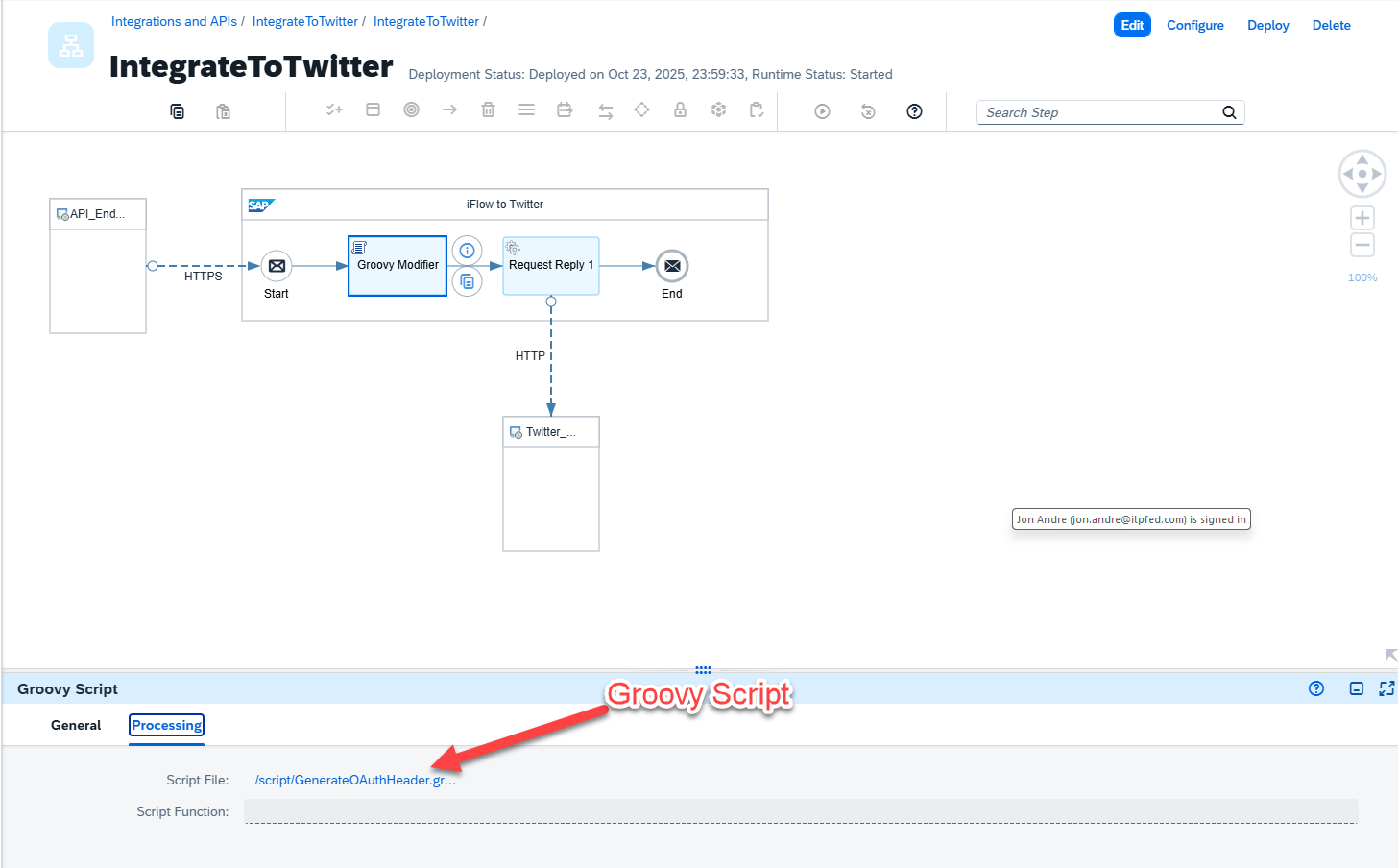 - The Groovy script, which can be recreated following steps marked “3” in the screenshot, converts the message coming from our ABAP extensions. The script also modifies the HTML headers to make sure it conforms with what the Twitter API. More on this later.